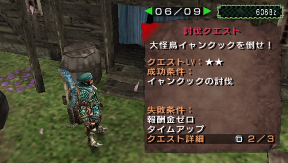 次のクエストはクックの討伐。屈強な自警団長からの依頼で、各地で人を襲っているイャンクックが森と丘に出現してしまったので、大被害が出る前にハンターに狩猟をお願いするとの事。