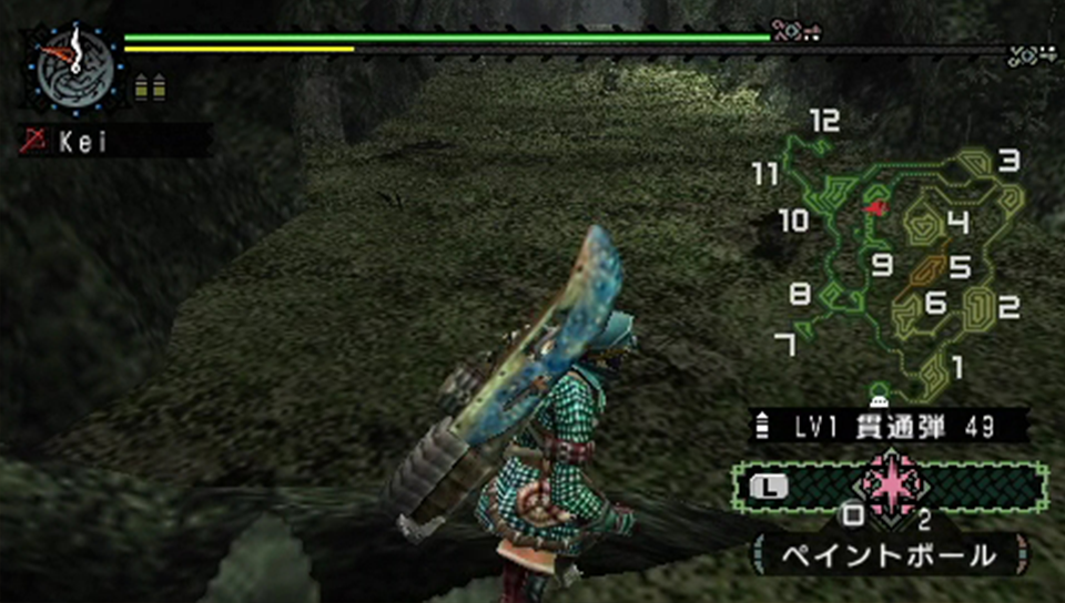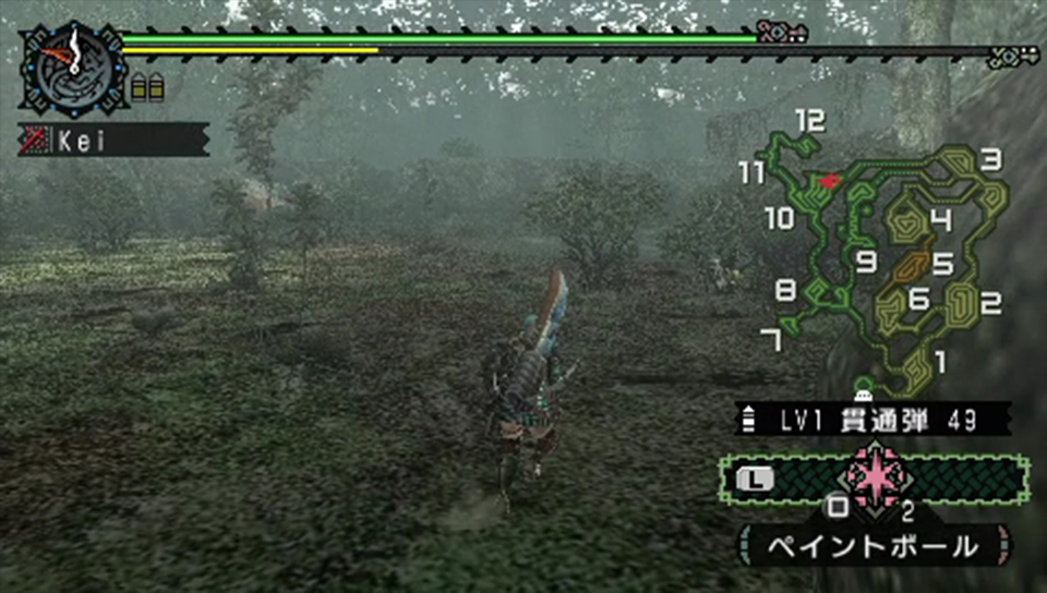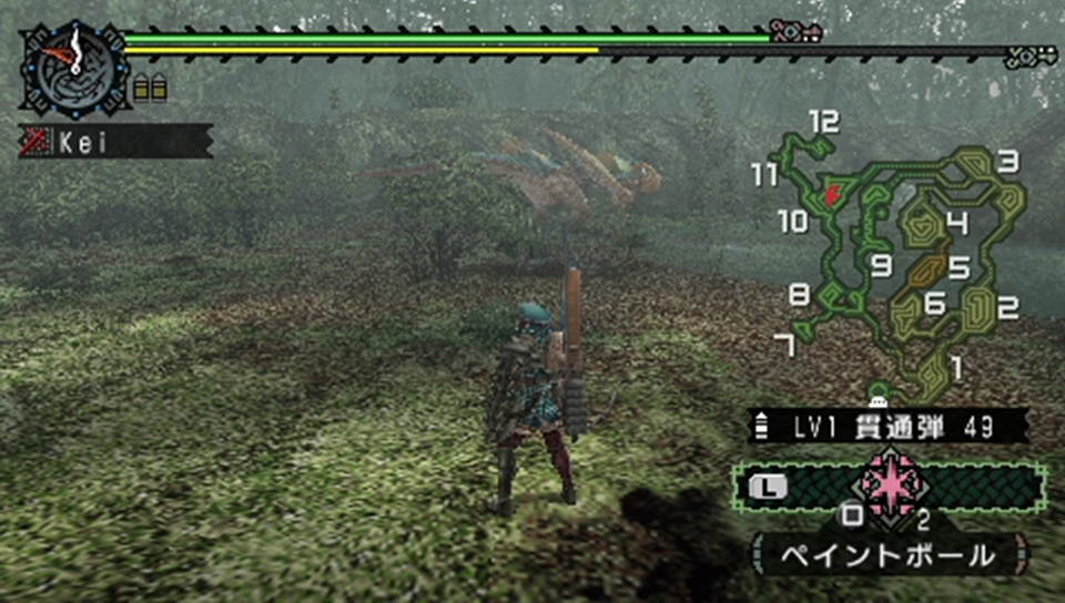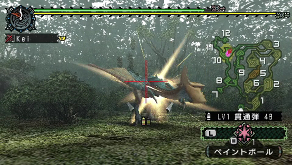 ペイントボールを当てつつ反撃をもらいながら戦闘開始。前回のクックは通常弾で立ち回ったので、今回は貫通弾で立ち回ってみる事にする。リペイントモンスターは原種とは違い、体力とスピード、更に攻撃力の面でも強化されている。その為、頭に狙いを定めるのが難しいと想定しての事だ。