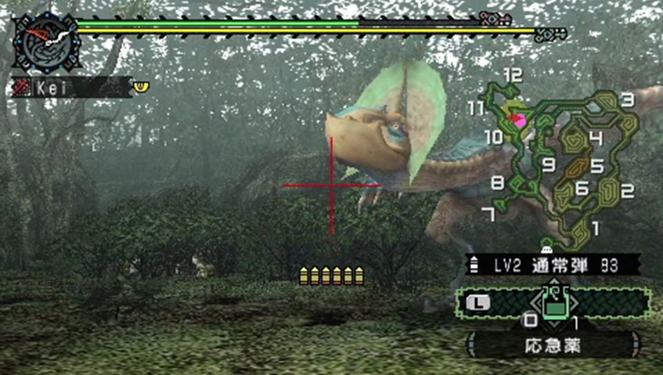 戦闘開始から11分、ココで2回目の怒り。体力が半分程だったので、最後の応急薬を投入。先程の経験から、怒っている最中は攻撃ではなく回避主体で立ち回る事にする。具体的には撃ち込み弾数を1発減らす感じだ。と、ココでクックが移動するも…。