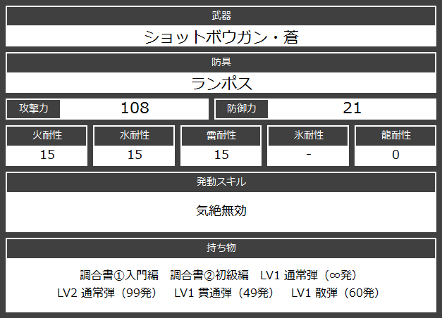 前回クックと戦った時は、およそ10分で勝利を掴む事が出来た。回復薬も支給品分で賄う事が出来たので、持ち物はLV2 通常弾と、ボックス整理の為に持ち出したLV1 貫通弾の端数分、後は取り巻きがいた時の為のLV1 散弾くらいで大丈夫だろう。