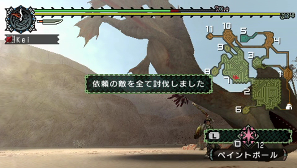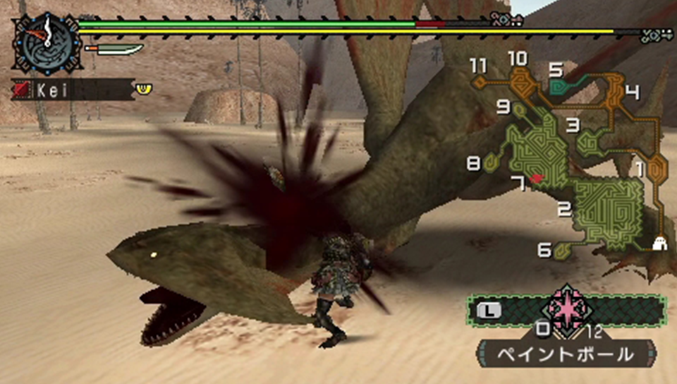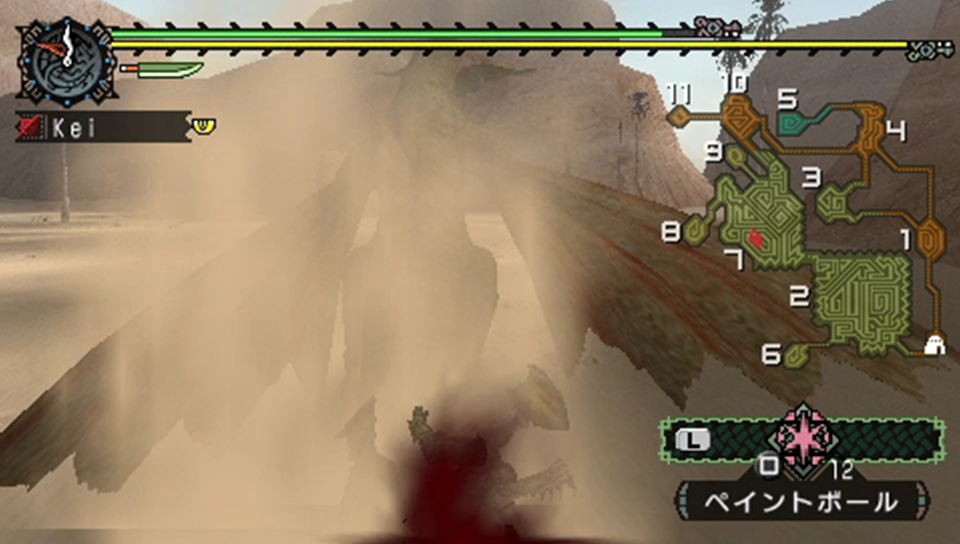 行動を先読みして定位置へ移動する…のだが、ペイントボールの投擲をすっかり忘れていた。しかしながら、基本的にドスガレオスは7番と2番を往復するだけなので、そこまで問題ではなかったりする。どちらかと言うと、投擲のスキにタックルを喰らう方が問題なのである。
